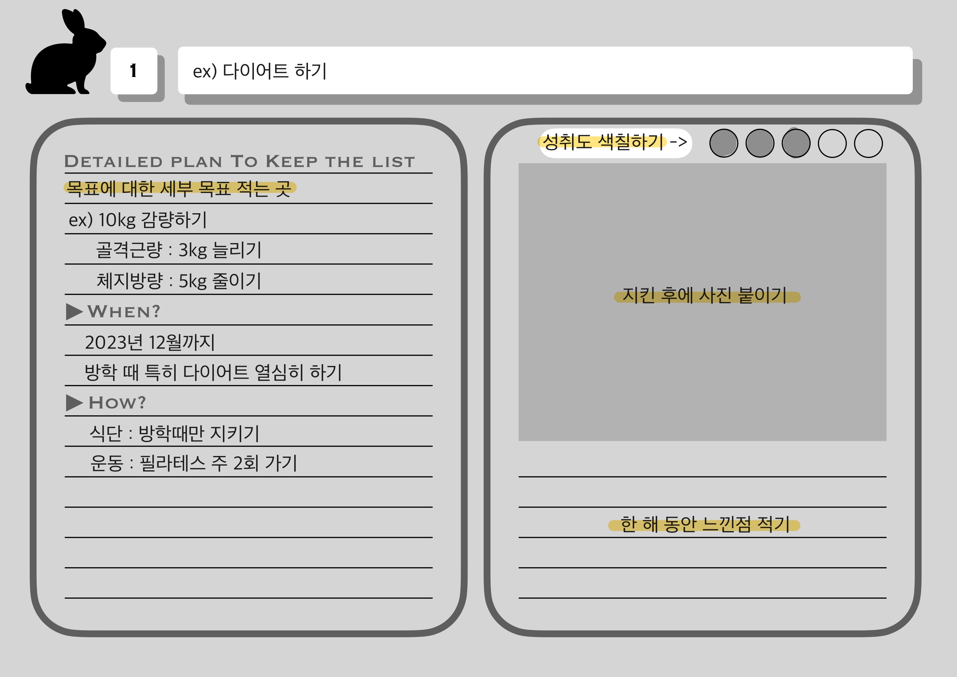 한 해의 시작과 끝을 모두 함께 할 수 있는 버킷리스트 속지라고 생각이 듭니다 : ) 저도 2023 새해 목표를 세워봤는데 생각보다 구체적이지 않으면 지키지 않을 것 같은 계획들도 많다는 생각이 들었습니다.