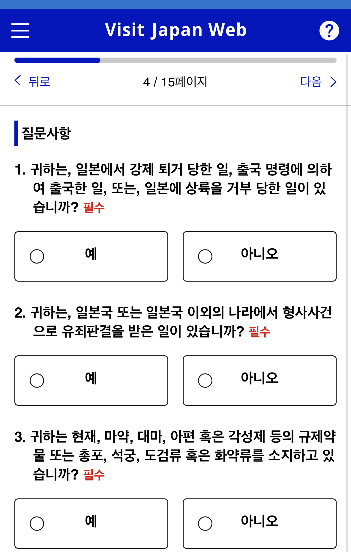 다음으로 입국심사 버튼을 누르면