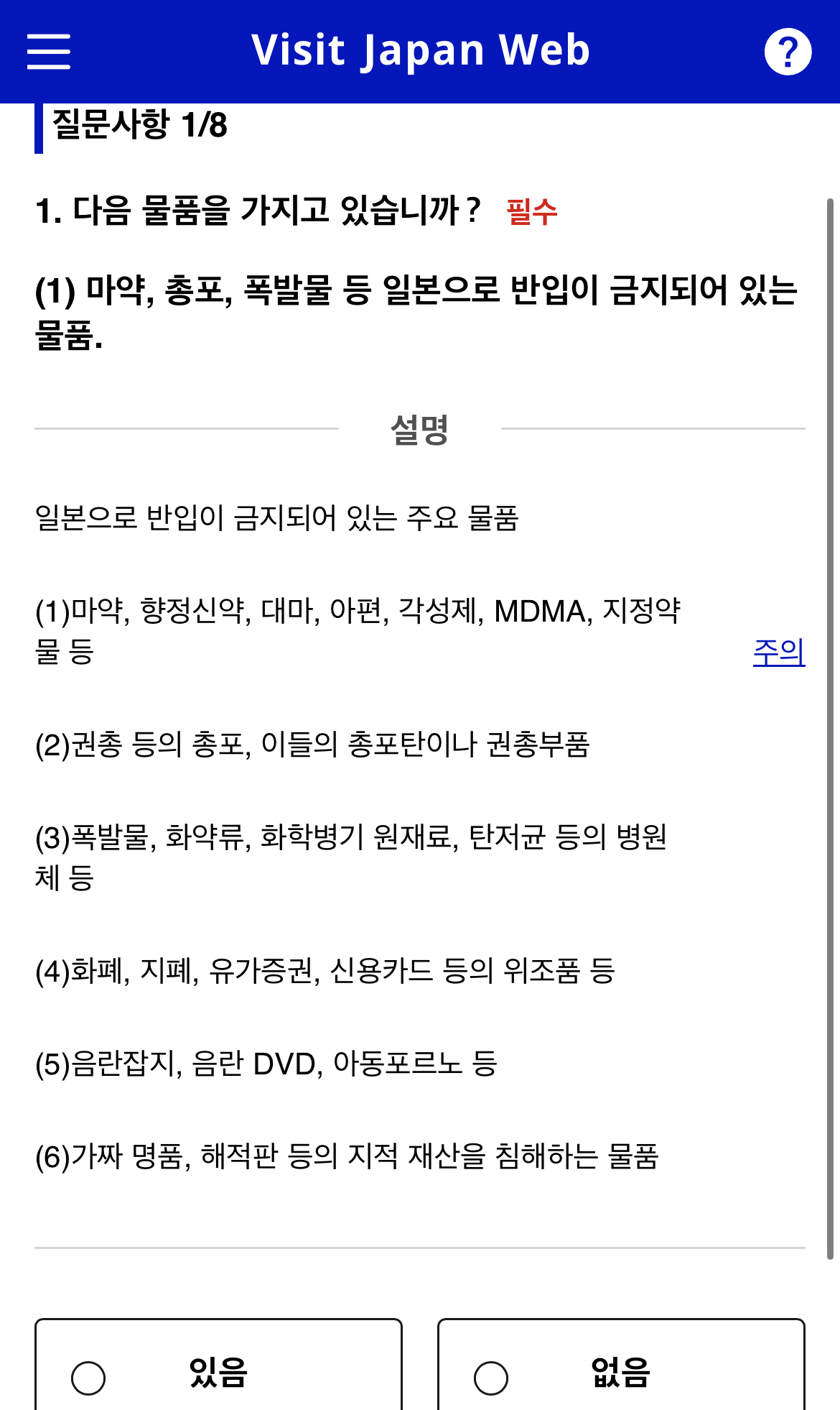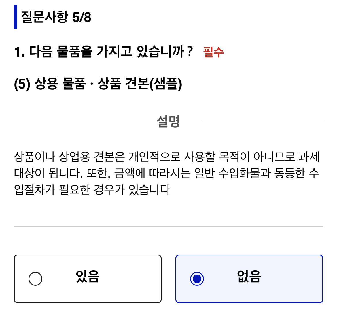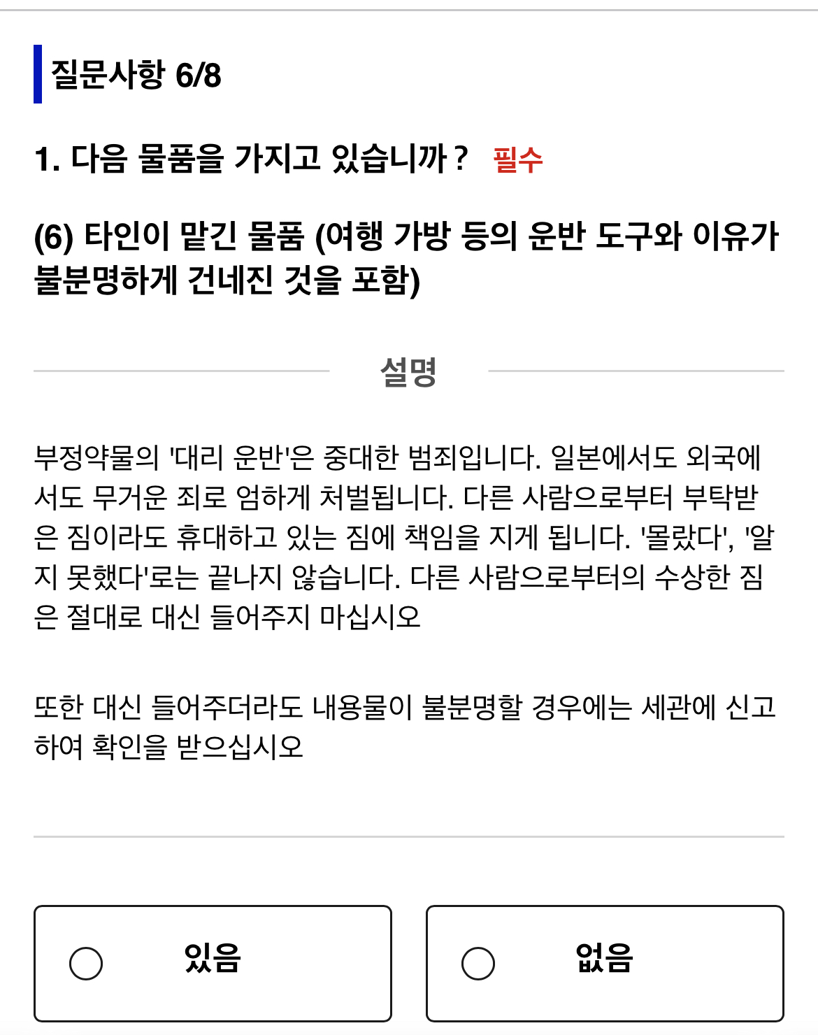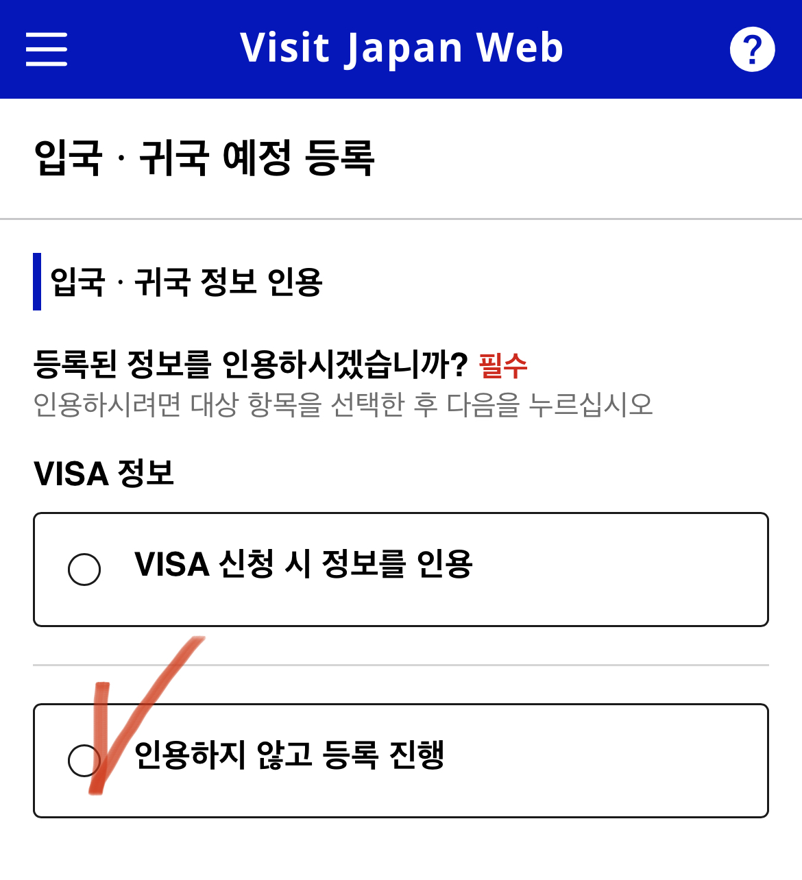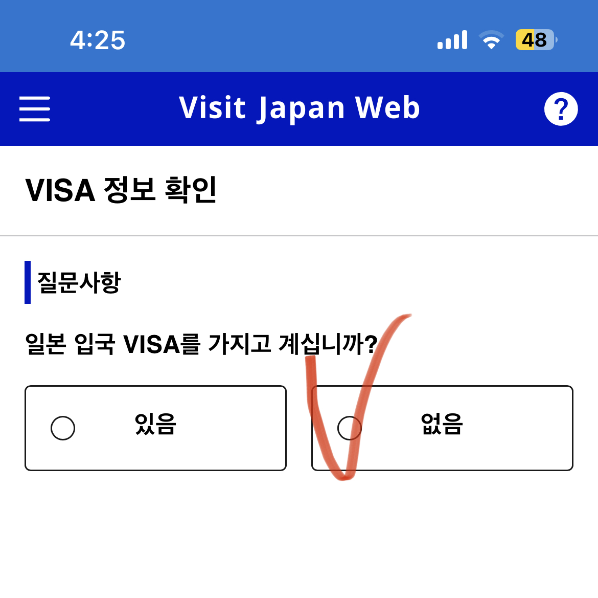 VISA 정보 확인에서는 ‘없음’을 누른다.