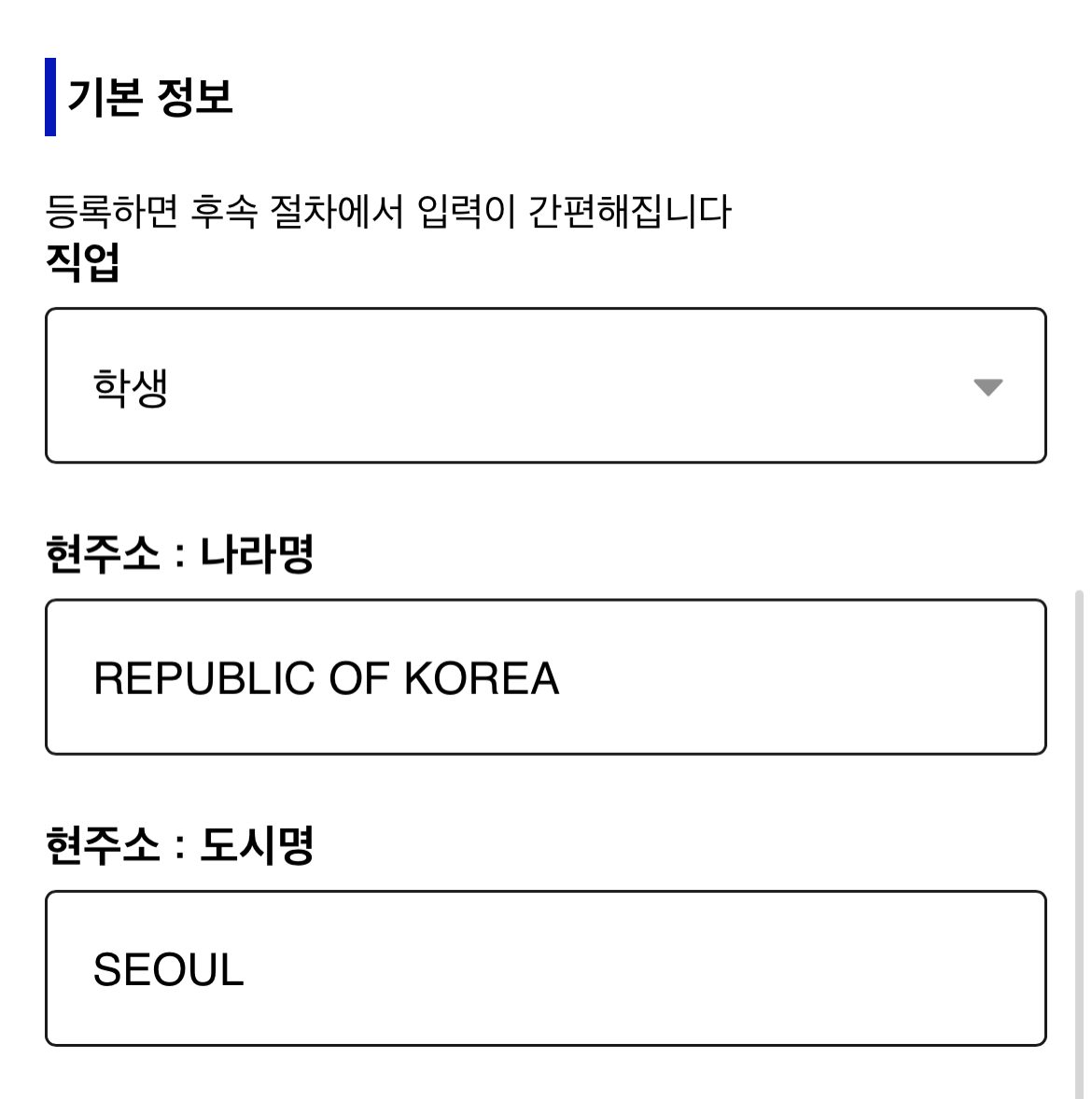 기본 정보에서 직업, 현주소 (나라명, 도시명)을 쓴다.